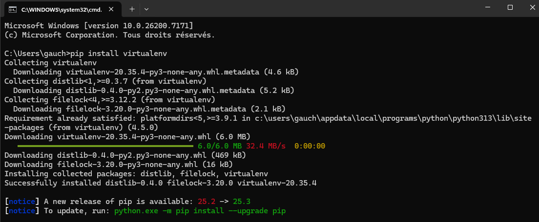 As-tu bien exécuté la commande “ensurepath” comme précisé dans le tuto ? Par acquis de conscience je préfère l’exécuter après chaque installation d’un composant d’environnement virtuel python. Et aussi fermer et redémarrer le terminal après chaque installation.