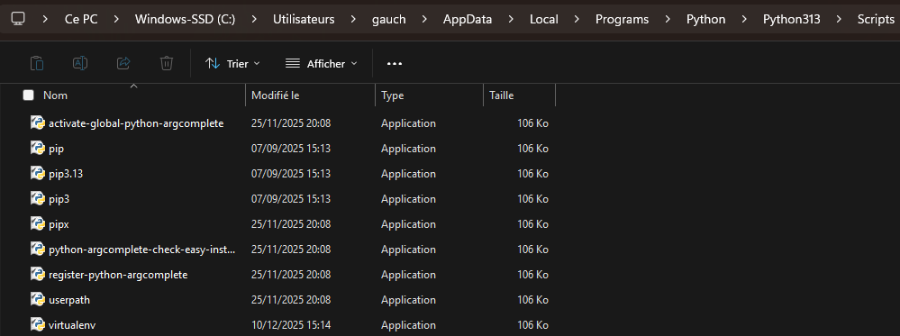 J’ai bien le répertoire ou il la commande a installé Python, j’arrive à lancer la commande Pip mais pas la commande Pipx, bien qu’elle existe dans le répertoire que j’ai installé :