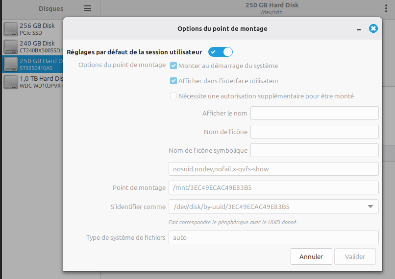 PS - l’utilitaire de disque permet de contrôler graphiquement le point de montage