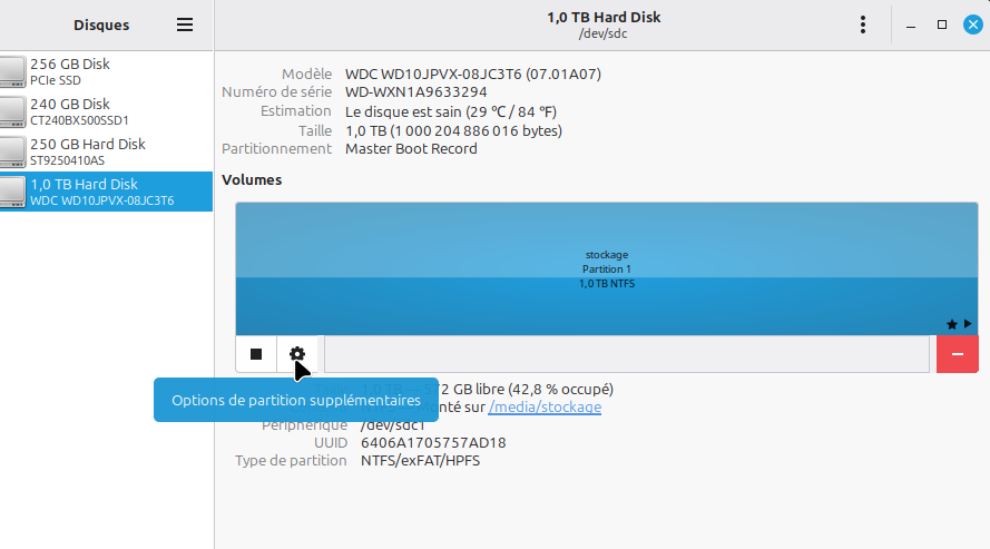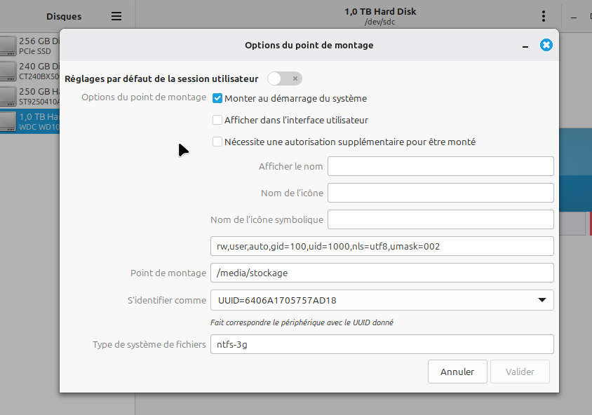 Sur ce second disque (voir ci dessous) je n’ai fait qu’activer le montage par défaut (de la partition ntfs) au démarrage du système de façon graphique avec l’utilitaire de disque) aucune ligne n’a été ajoutée dans le fichier /etc/fstab et la partition est bien visible lorsqu’on utilise ART