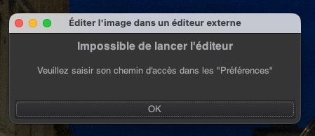 Je crois avoir essayé toutes les formulations possibles avec les éléments du chemin mais rien ne me donne d’autre message que “Impossible de lancer l’éditeur, veuillez saisir son chemin d’accès dans les préférences“, capture ci-jointe.