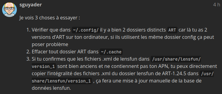 @alain_gre, cela m’a fait rire et plaisir que tu écrives que tu aurais “lâché l’affaire depuis bien longtemps” : j’étais en effet prêt à aller dans ce sens, mais d’un autre côté j’ai appris beaucoup grâce à nos échanges, que ce soit sur Linux ou ART, et sans cette déconvenue je n’aurais pas appris autant et serais resté ignare des quelques manips et autres compréhensions qu’il y a derrière. Donc, oui, c’est du temps passé, mais de mon point de vue, même s’il n’a pas été des plus efficaces, il a créé une valeur ajoutée.