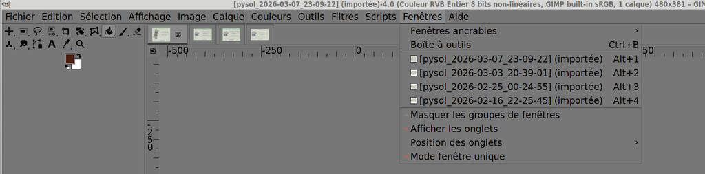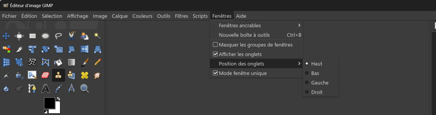 Pour répondre à la question, avec la même version de GIMP, je vois ceci dans le menu Fenêtres