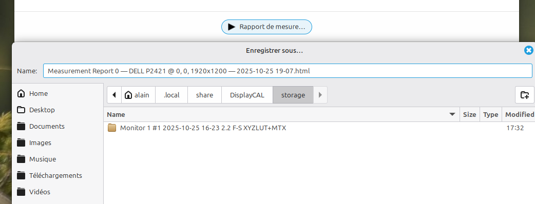En cliquant sur le bouton “Rapport de mesure” de Displaycal ’on peut voir le dossier (caché) d’installation du profil de couleurs ( pour une installation mono utilisateur