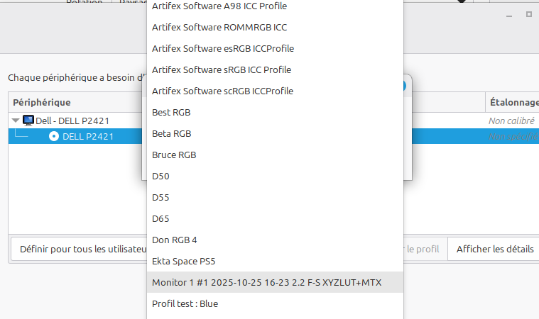 Mais en sélectionnant la ligne correspondant à celui-ci l’on peut alors par un clic droit (menu contextuel) faire apparaître une liste de profils disponibles parmi lesquels se trouve celui qui vient d’être crée (avec une date et heure) par displaycal