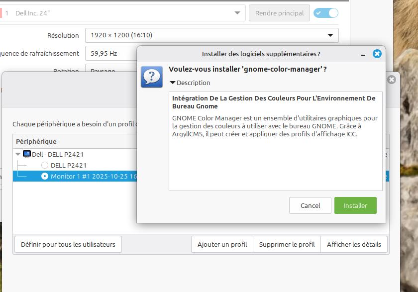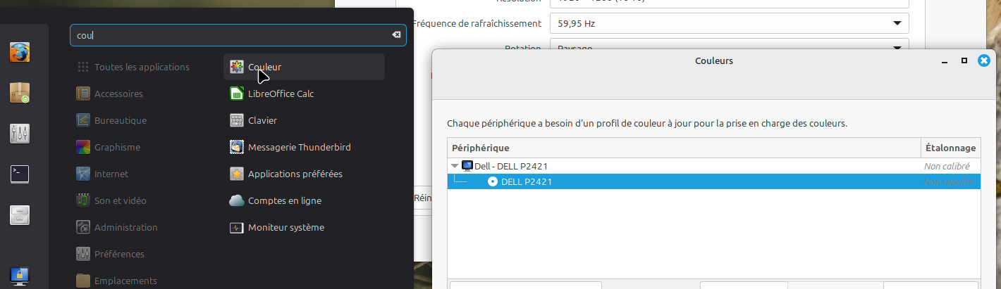 Etant donné que le profll est créé c’est maintenant chose facile de l’attribuer au moniteur avec l’utlitaire “couleurs” de gestion des couleurs qui est disponible dans les menus de l’installation de base de linux mint.
