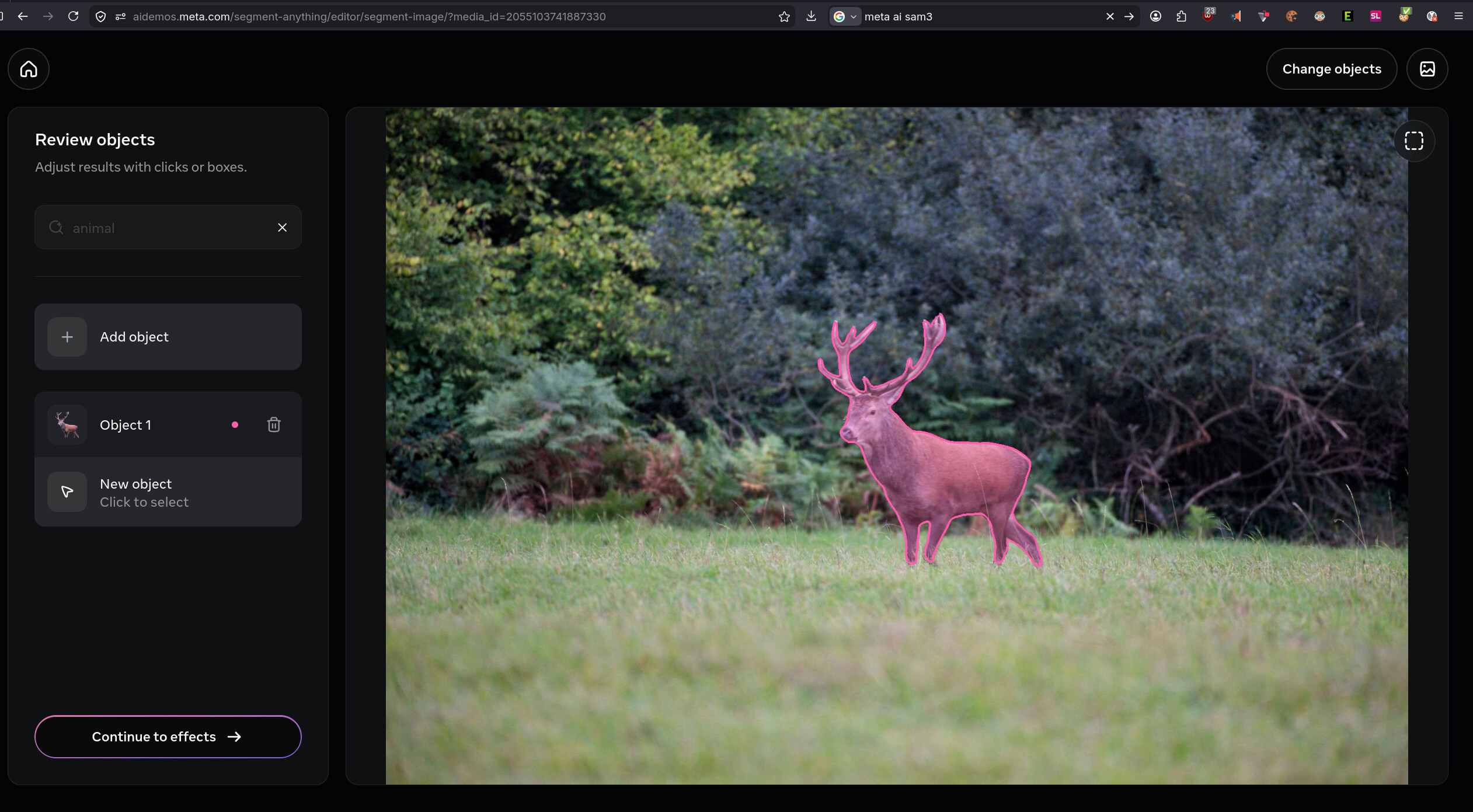Se rendre - sans obligation de se connecter - sur le site, charger son image png. On est parfois obligé de s’y reprendre à plusieurs fois ! Une fois l’image affichée, faire une recherche (à gauche) du sujet objet du masque : ici “animal”. L’IA détoure bien le sujet avec possibilité d’ajuster :