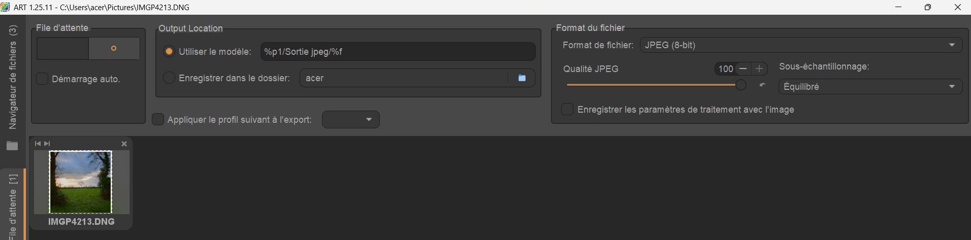 Lorsque je développe le fichier, la sortie jpeg ou tiff est automatiquement placée par Art dans le répertoire d’origine dans un nouveau répertoire que j’appel “Sortie Jpeg” avec l’option Output Location dans la file d’attente.