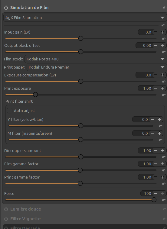 AgX-emulsion a pour but de répliquer le comportement de films et papier photo, et du processus de développement photochimique. S’il y a “AgX” dans le nom c’est peut-être parce que sous le capot la plage dynamique suit un comportement comme AgX de Darktable (on peut constater que les hautes lumières ne sont pas écrêtées par exemple) mais on n’y retrouvera pas du tout les mêmes réglages de contraste car justement l’objectif est que le contraste soit celui qui provient naturellement du film/papier choisi.”