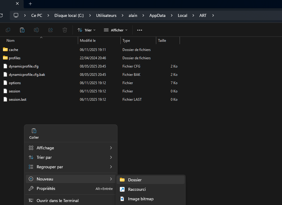 pour les placer dans un répertoire du programme ART sauf qu’il ne s’agit pas du dossier d’installation du programme (ART) mais du dossier du profil de l’utilisateur d’ART et plus précisément d’un dossier caché qui se trouve dans le répertoire AppData pour les utilisateurs de windows -