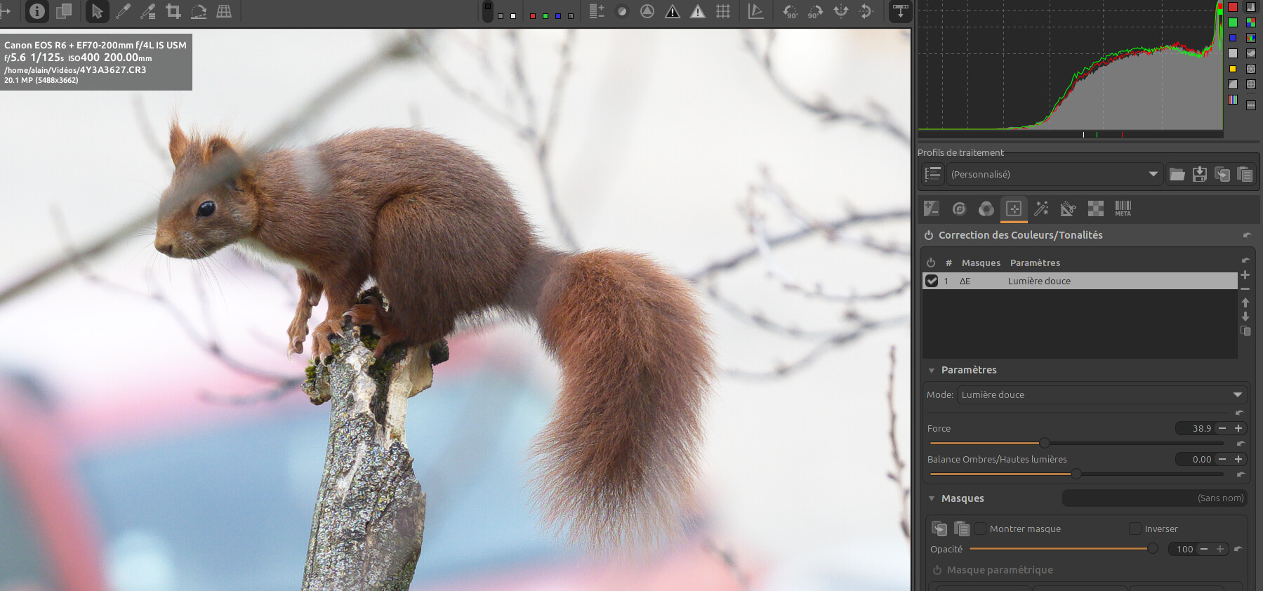 Et choisir d’appliquer le script “lumière douce” uniquement à ce masque et en affinant les paramètres ( la force et la balance ombres / hautes lumières)