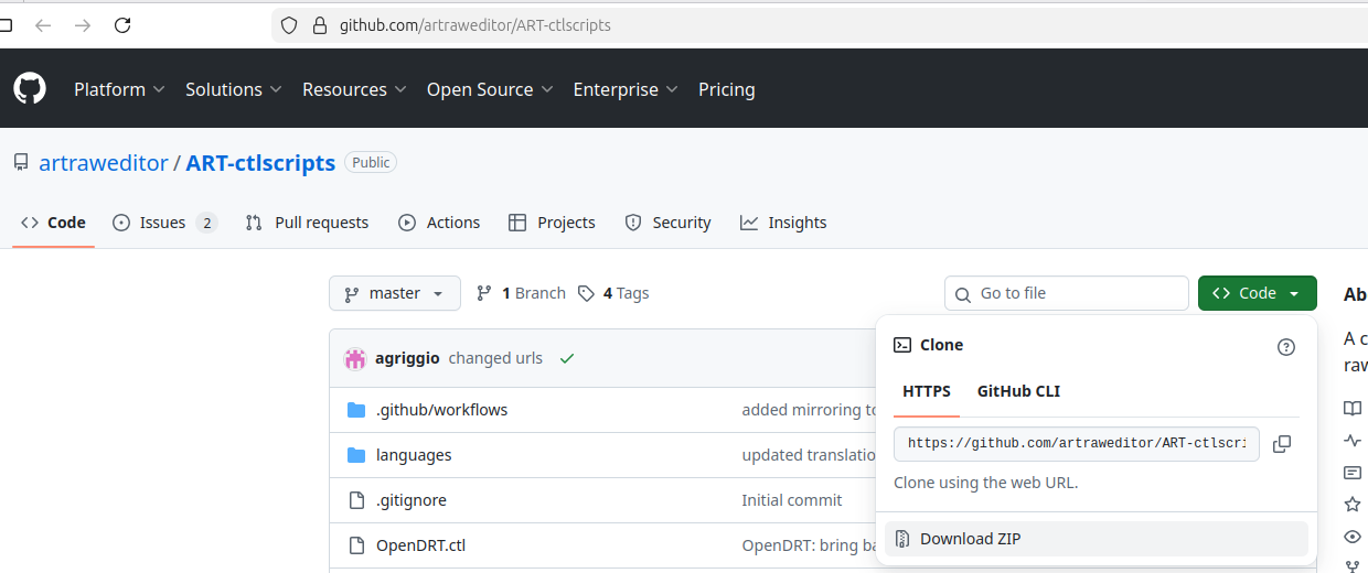 Pour info : pour téléchager les scripts de la page de GitHub - artraweditor/ART-ctlscripts: A collection of CTL scripts for the ART raw processor il faut cliquer sur la case verte ”Code” qui ouvre la fenêtre ou l’on voit l’archive zip (à télécharger (dowload)
