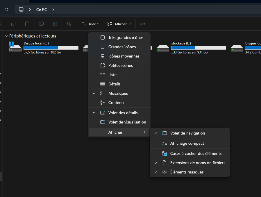 - il faut donc déjà cocher une option dans l’explorateur de fichiers de windows pour voir les dossiers cachés. Cette option s’appelle Afficher > … éléments masqués :