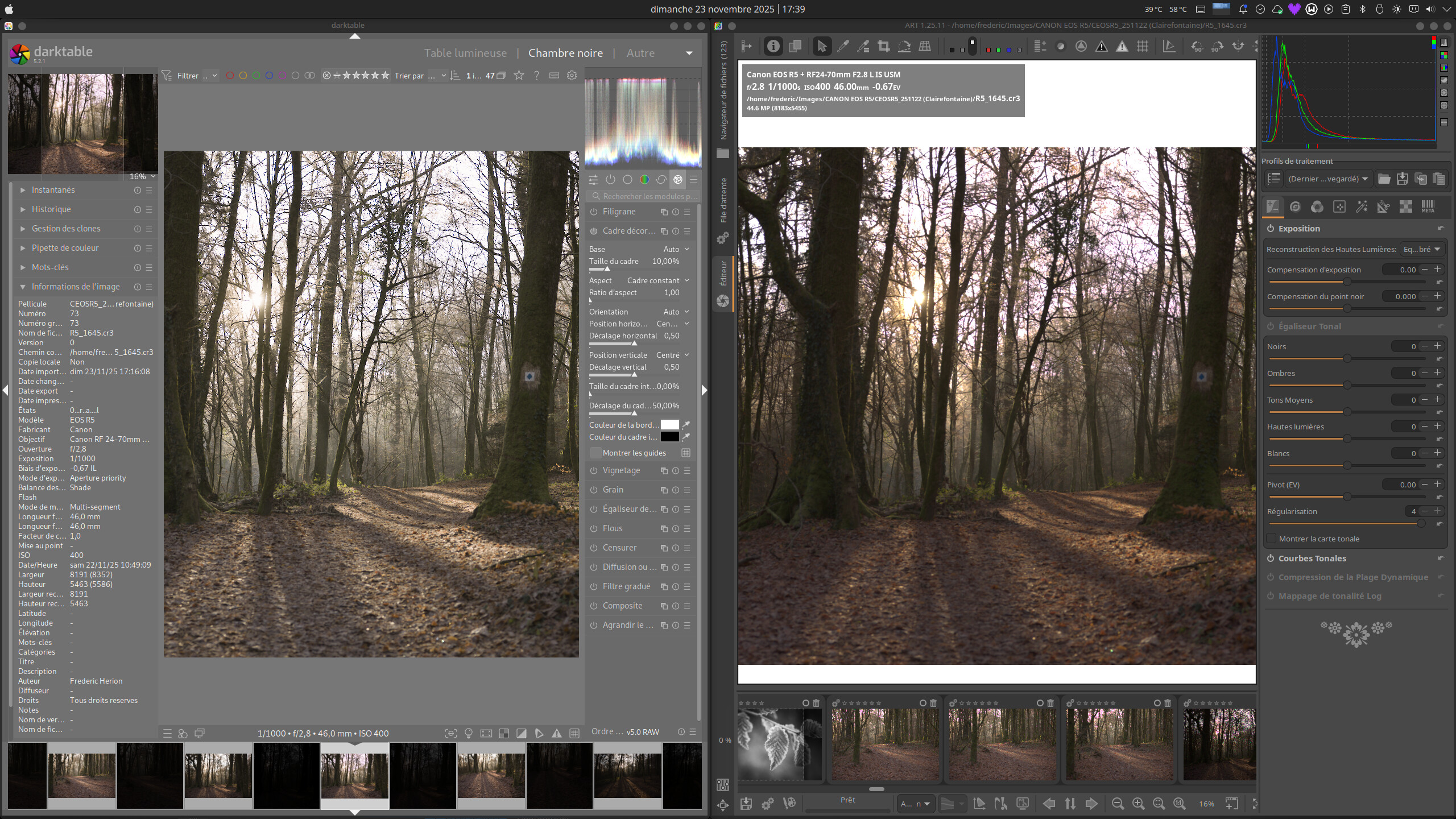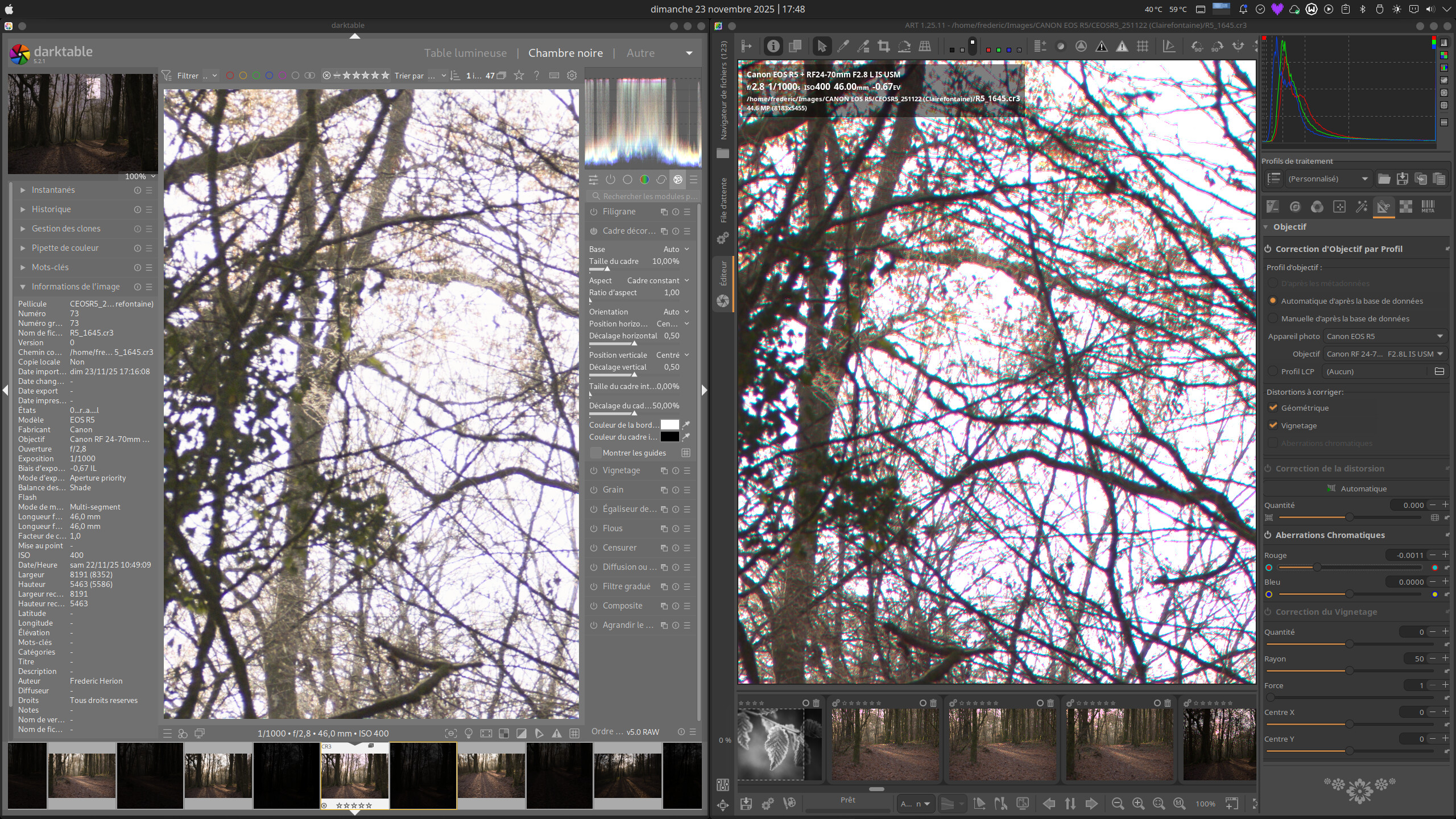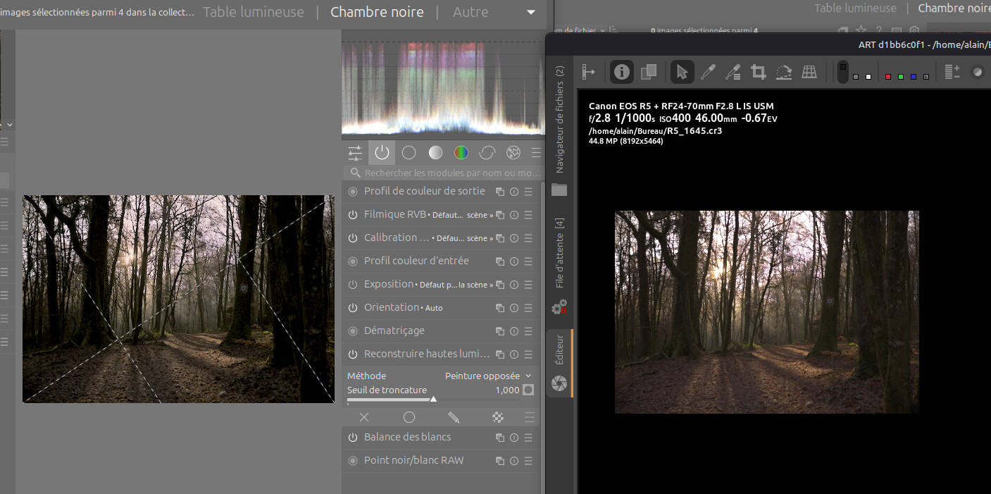 Par curiosité je décide de regarder mas raws dans Darktable (que je n’utilise jamais) et là je retrouve mes images raw auxquelles je suis habitué. Que se passe-t-il ? Je joins une capture d’écran des deux applis, à gauche Darktable et à droite ART. Dans les deux cas je n’ai effectué aucun traitement. On voit en plus dans ART comme une dominante magenta dans les branches à contre-jour. Inexplicable pour moi mais j’imagine qu’il y a une raison. Quelqu’un a-t-il une idée ? Je suis perdu