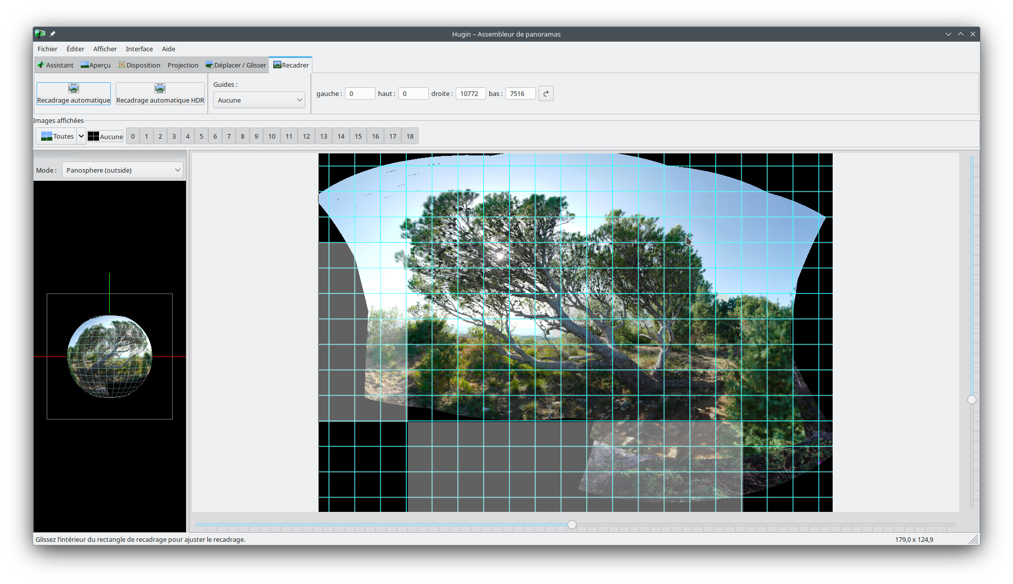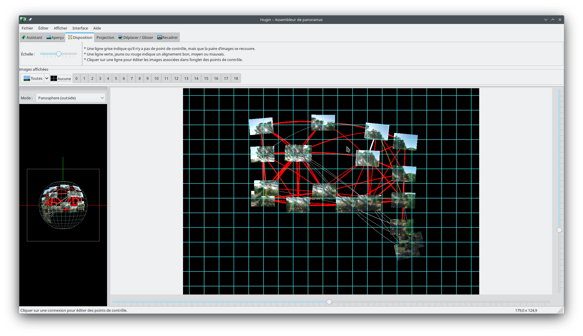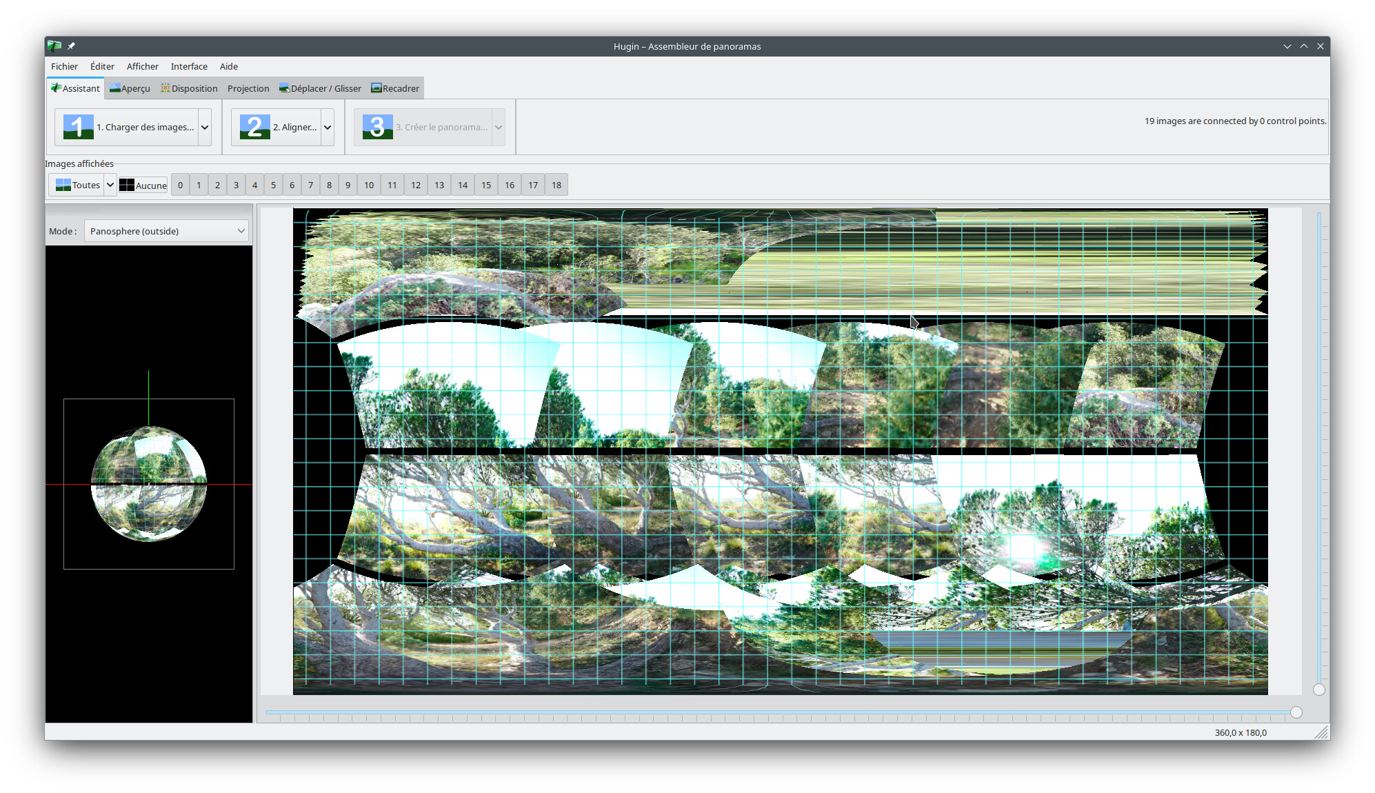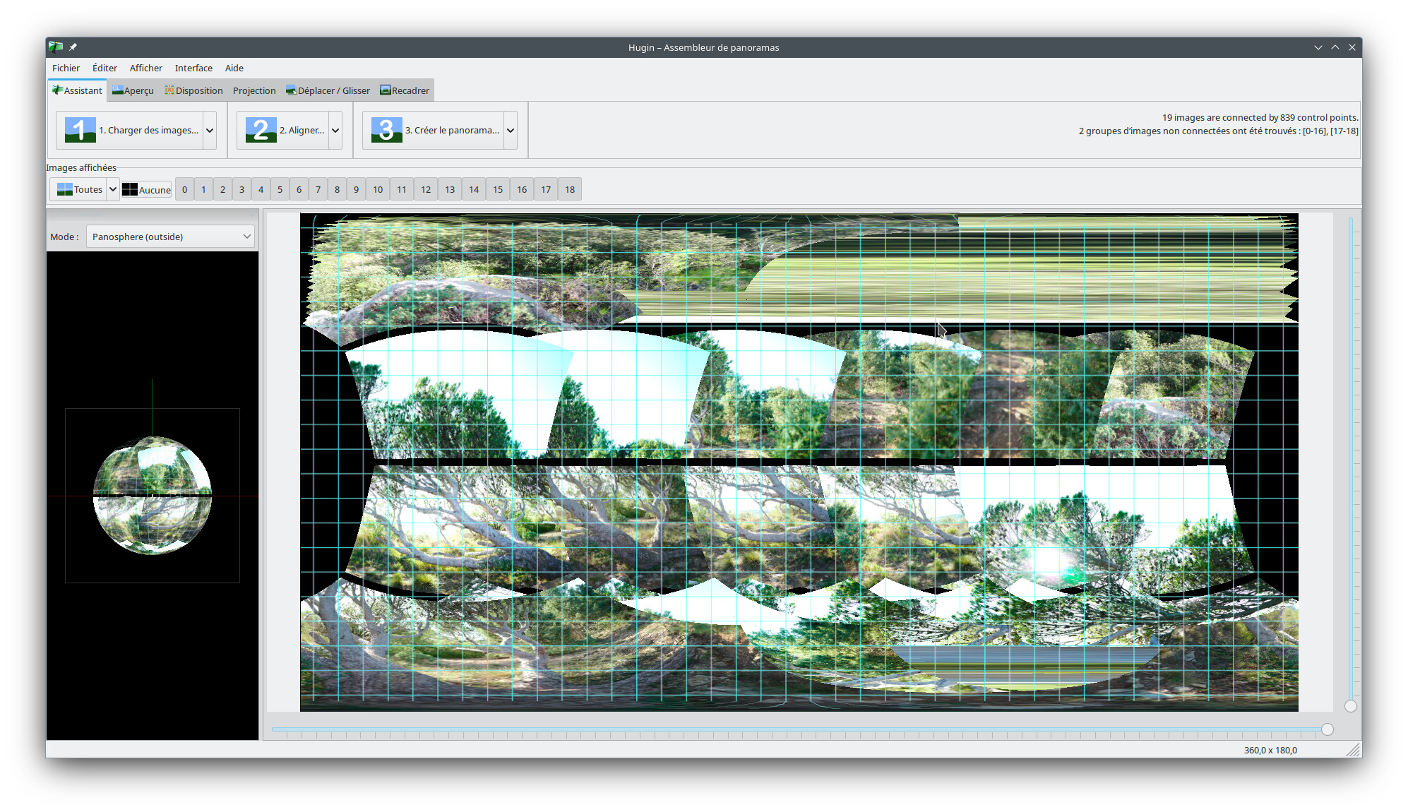 Je viens d’essayer avec Hugin, j’ai dû sélectionner 19 vues et exclure les premières qui semblent ne pas appartenir au pano :